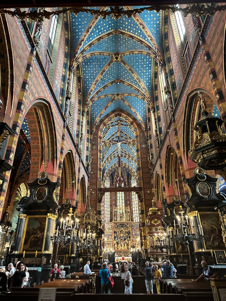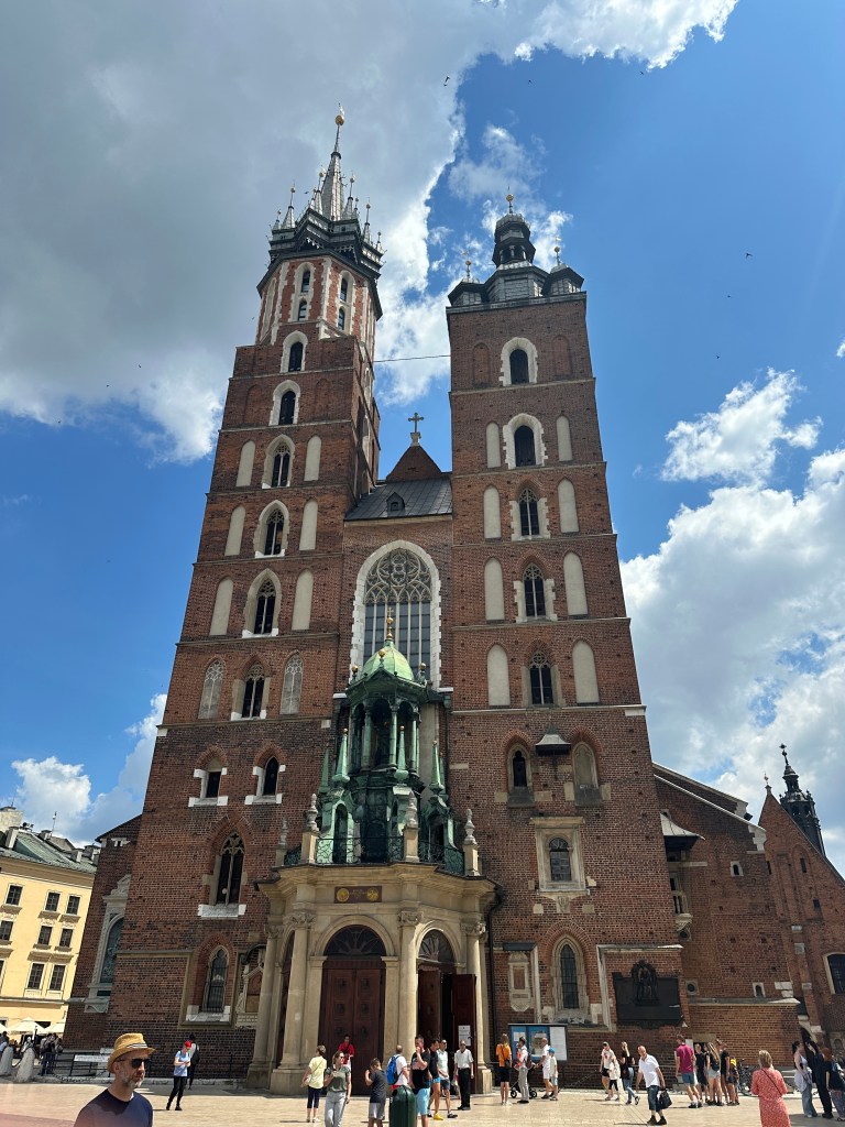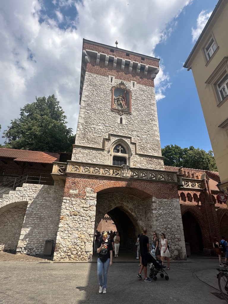 At 11:30, I downloaded an app called Krakow Tours and embarked on a self-guided tour of the city’s main sights. The Barbican, a fortified outpost once connected to the city walls, is a testament to Krakow’s medieval past. Its circular structure and numerous watchtowers offered a fascinating glimpse into the city’s history. St. Florian’s Gates, the only remaining part of the old city walls, was a majestic sight. The gate, adorned with a baroque roof and a statue of St. Florian, was a symbol of the city’s resilience. The sight of St. Mary’s Basilica, with its two uneven towers and stunning facade, was breathtaking. The interior was even more impressive, with its ornate altarpiece and beautiful stained glass windows.