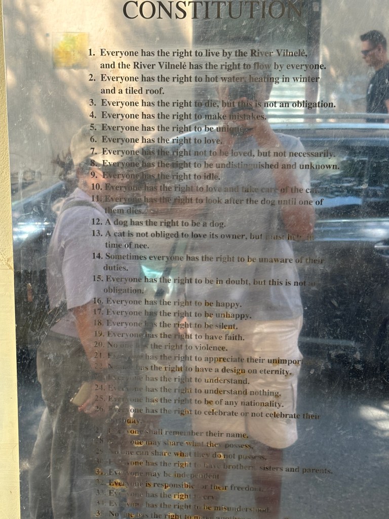 Our detour to Uzupis, a district of artists, was a delightful surprise. Declared as an independent republic by its inhabitants in 1997 as a prank on April Fools, Uzupis has its own constitution, president, throne, currency, and even a national day, which is the 1st of April. The bohemian spirit of Uzupis, its vibrant art scene, and the unique and comical constitution (which includes rights like “Everyone has the right to understand nothing” and “Everyone has the right to be unique”) made it a memorable part of our tour. It was like stepping into a different world, where creativity and freedom of expression were celebrated. I highly recommend reading the points in the picture below as it will definitely make you laugh.