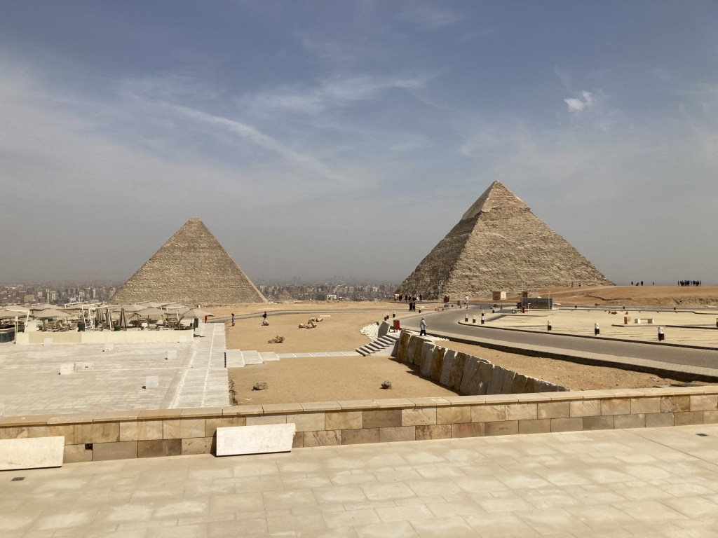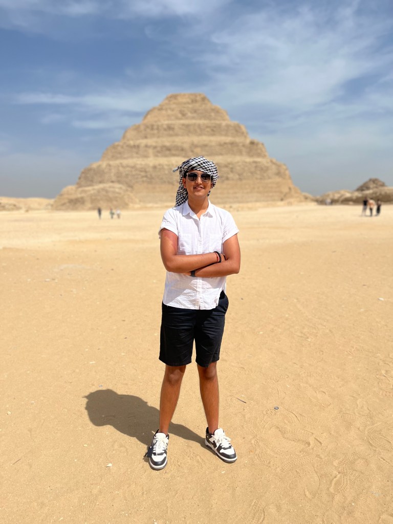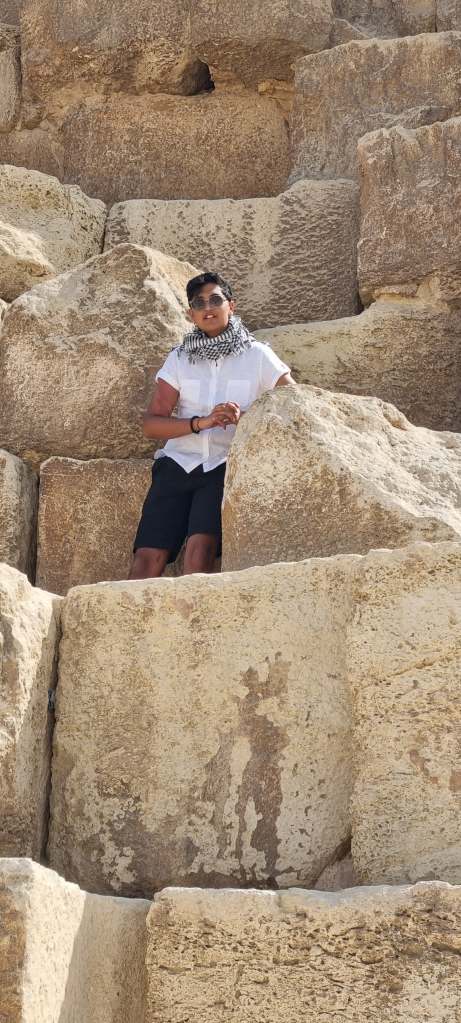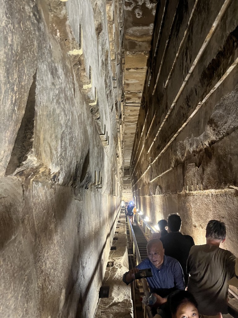 Speaking of the Pyramids of Giza, stepping into the necropolis was like entering a time in BC. Towering above us at a staggering 146 metres, the Pyramid of Khufu was a testament to ancient prowess and sheer will. Ascending within its confines was a more formidable task than at Nefertiti’s—stifling heat and overwhelming humidity made it a herculean effort. The panoramic viewpoint later offered us a canvas to capture memories, with the pyramids posing in their grandeur.