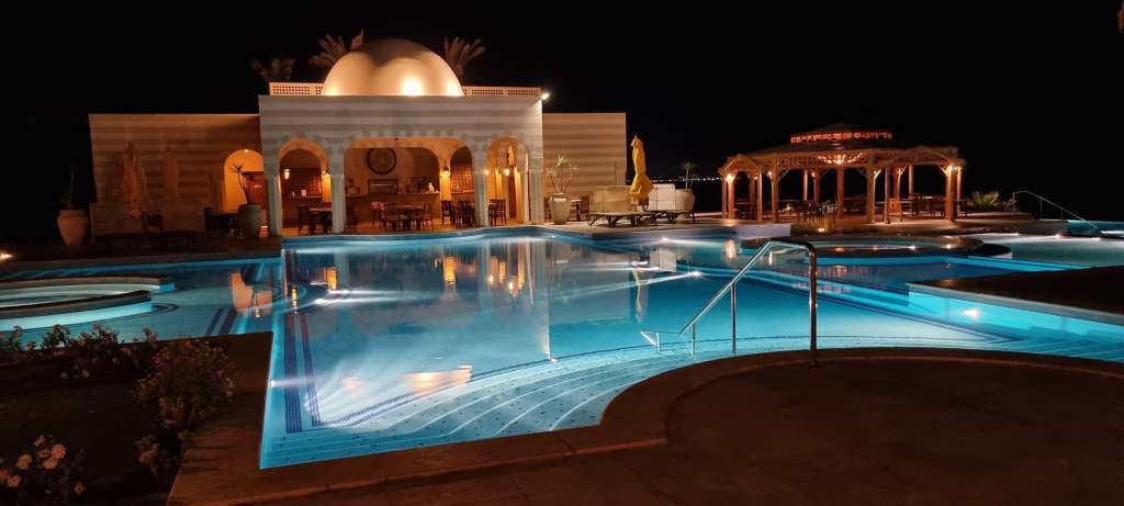 Diving back into our day, after visiting at Karnak temple, we found modern luxury awaiting at the Oberoi Sahl Hasheesh in Hurghada. Nestled on the Red Sea’s shores, this retreat offered us not just a taste of opulence but tranquillity, starting with a refreshing poolside lunch. Amidst the expansive, sun-drenched property, we indulged in a light yet satisfying meal of pastas and gazpacho, the perfect fuel for our next adventure—a session at the hotel’s gym.