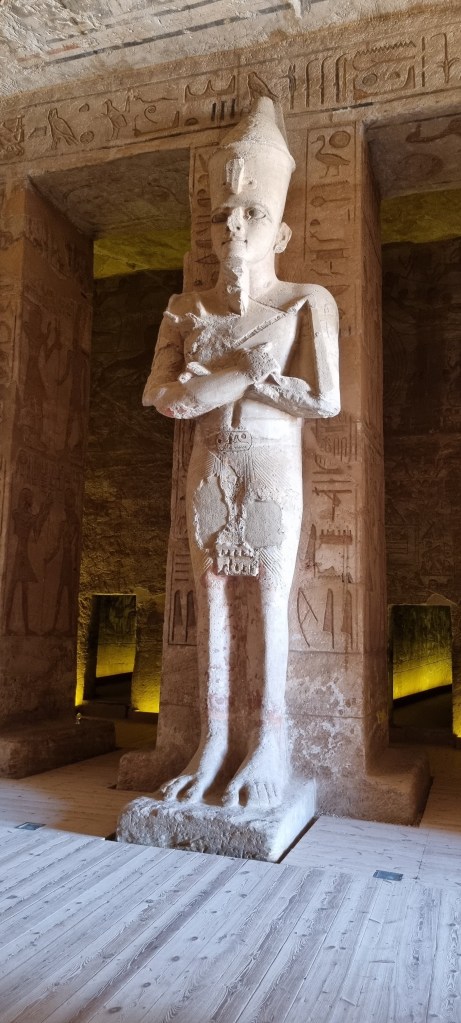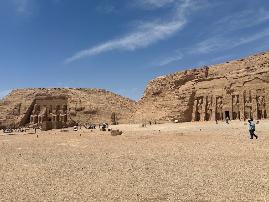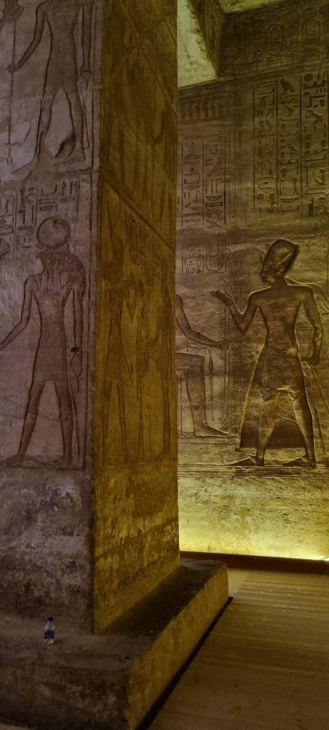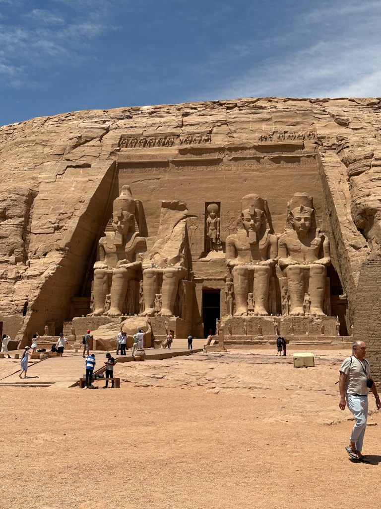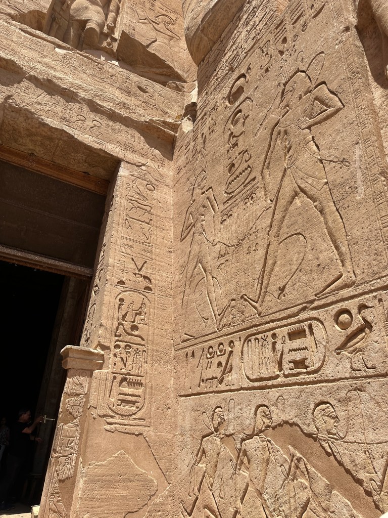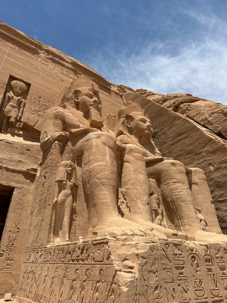 Straight off the plane, we journeyed to Abu Simbel, reaching around 11:30 am. Picture this: two monumental temples, carved out of rock during King Ramses II’s reign around 1200 B.C. One is a tribute to the king himself, and the other, a romantic gesture to his queen, Nefertari. The exteriors of these temples are nothing short of majestic, with colossal statues guarding the entrance. Inside, a hieroglyphic heaven awaits, with walls adorned with intricate carvings depicting tales of gods, battles, and the daily life of one of history’s most fascinating civilizations. For temple newbies like us, it was the perfect introduction. If photos were a currency, we’d be millionaires!