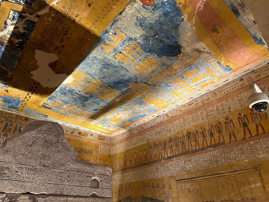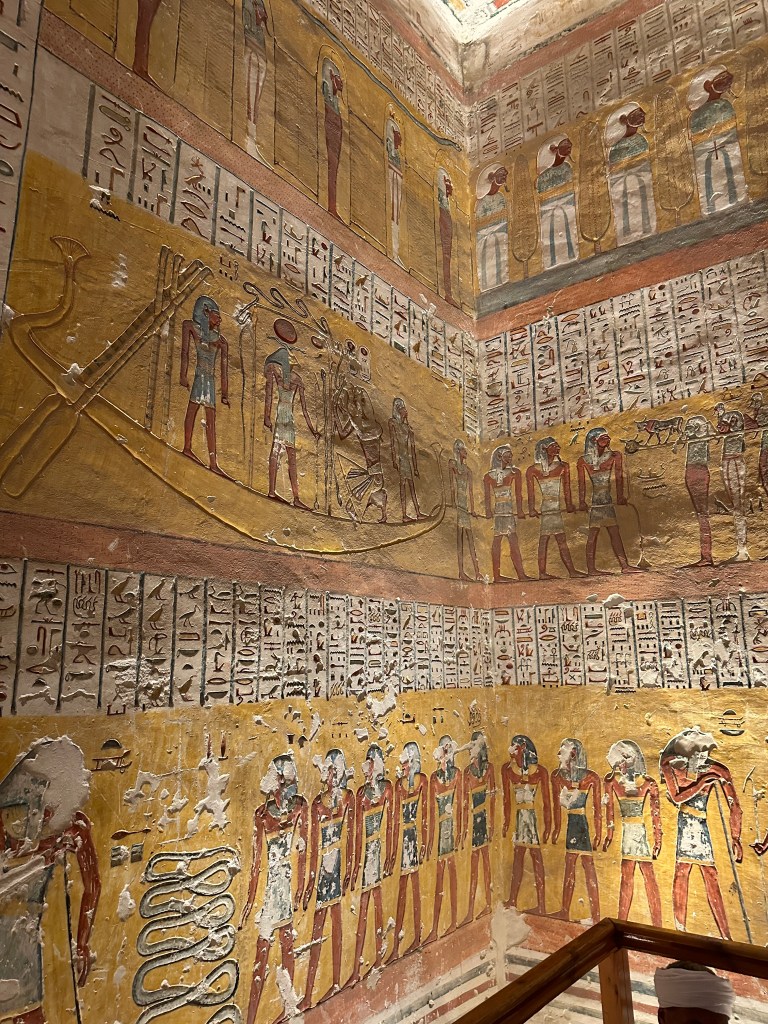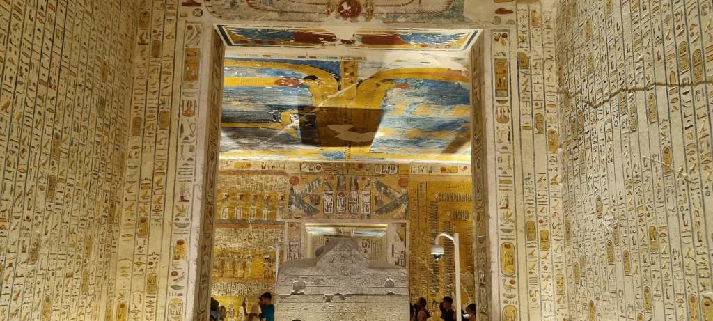 Luxor, the city where ancient royalty favoured hidden tombs over towering pyramids, unfurls its history alongside the Nile’s gentle flows. Our exploration commenced at the dawn of civilization in the Valley of the Kings. This necropolis, set against the backdrop of rugged cliffs, served as the final resting place for Egypt’s greatest rulers. Unlike their predecessors who opted for pyramids, these pharaohs chose the valley’s secrecy to guard against grave robbers. With tombs adorned in vibrant hieroglyphics, the site offers a colourful passage into the afterlife, narrating tales of divine journeys and earthly triumphs. Here, we stood where Tutankhamun was buried and also along the tombs of Seti I and Ramses II.