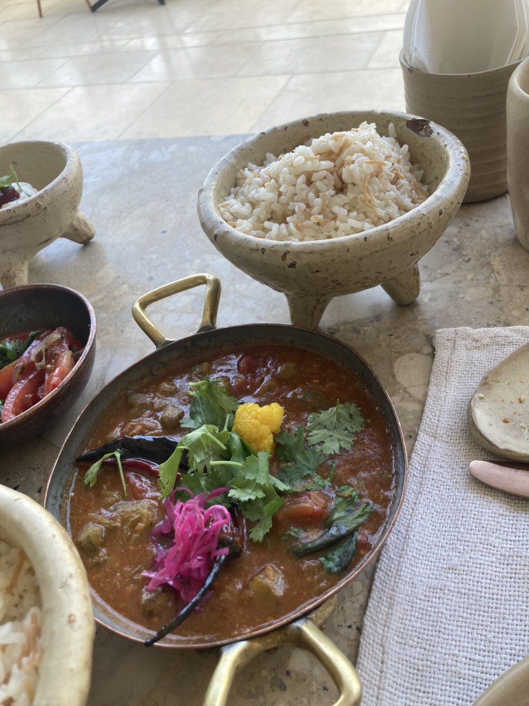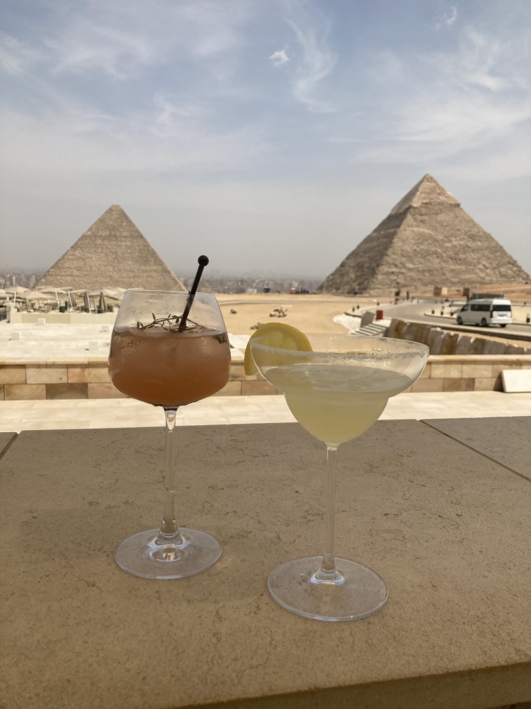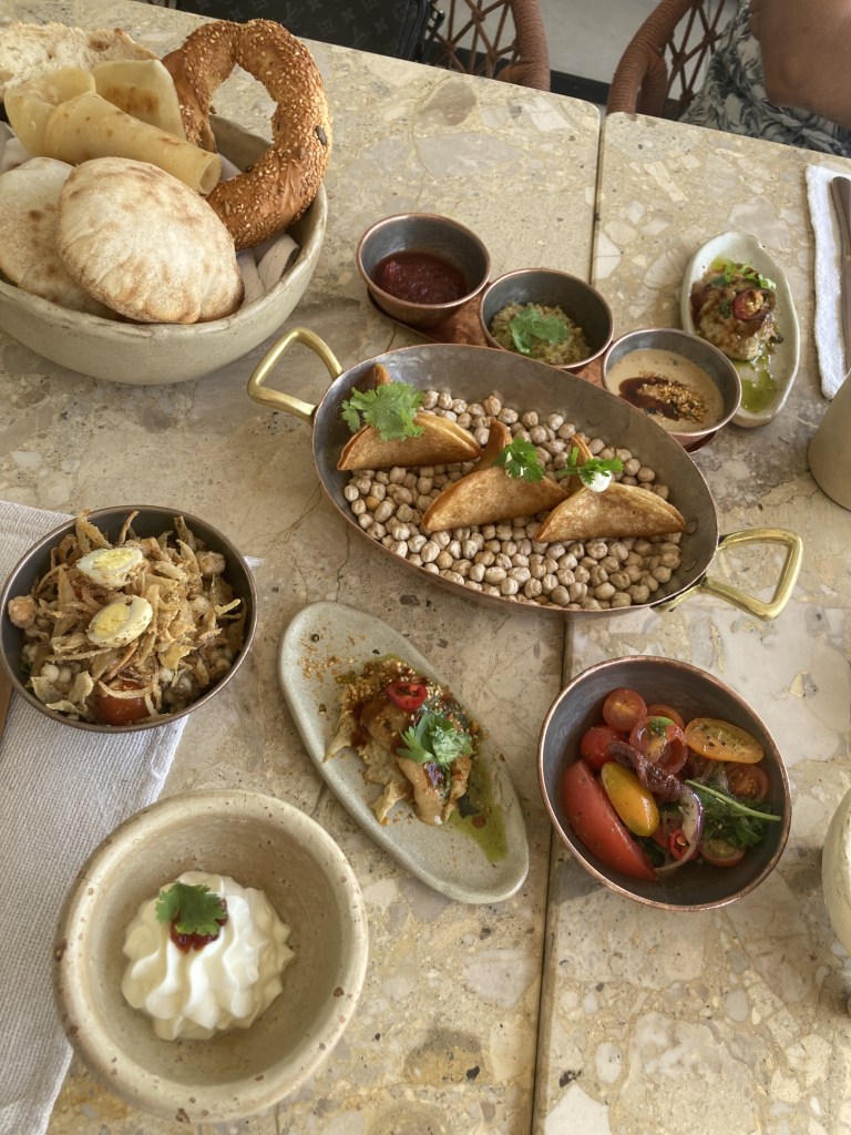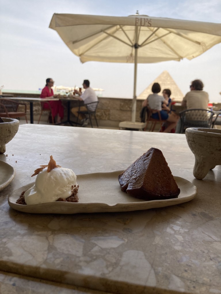 Lunch at Khufu’s transformed into a sumptuous narrative as plate after plate arrived, weaving a story of flavour and heritage of Egypt. The Koshari Salad, Baba Ganoush, and Wara’ Enab were joined by the smoky tomato salad, the rich cottage cheese with chilli jam, the delightful Qatayef, and the crisp fried street style potatoes. Each dish was a vignette, capturing the essence of Egypt’s culinary spirit, enhanced by the vista of the great pyramids in the Giza complex.