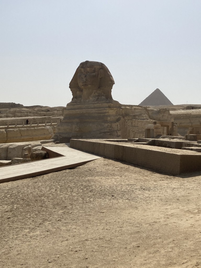 The Sphinx – a lion body and a human head –  which was our next and last stop in Giza endured a millenia, with its enigmatic gaze, was the change in scenery I didn’t know I needed. After a day surrounded by the solemnity of tombs and temples, the Sphinx’s mythical allure provided a refreshing narrative shift.
