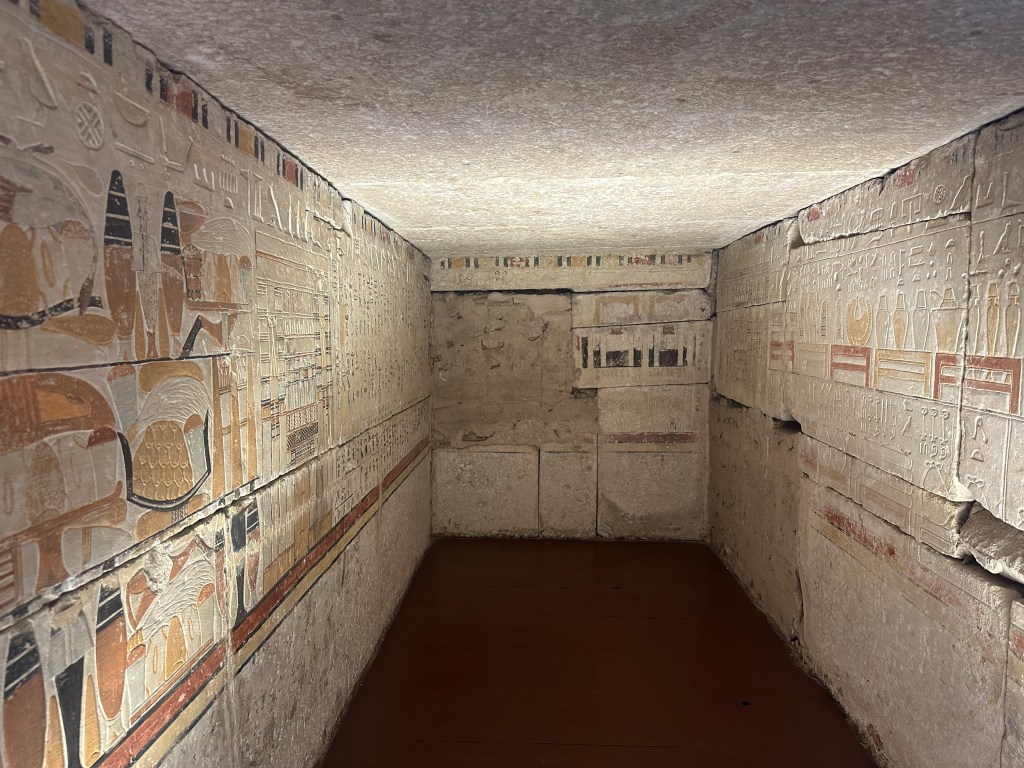 Our adventure took a daring turn as we ventured into the Pyramid of Nefertiti in the Saqqara complex. The journey was a test of flexibility and endurance, bending and crawling to under three feet in near darkness until reaching the central chamber that houses only a stark sarcophagus. The void of treasures inside did nothing to diminish the exhilaration of stepping into ancient history itself.