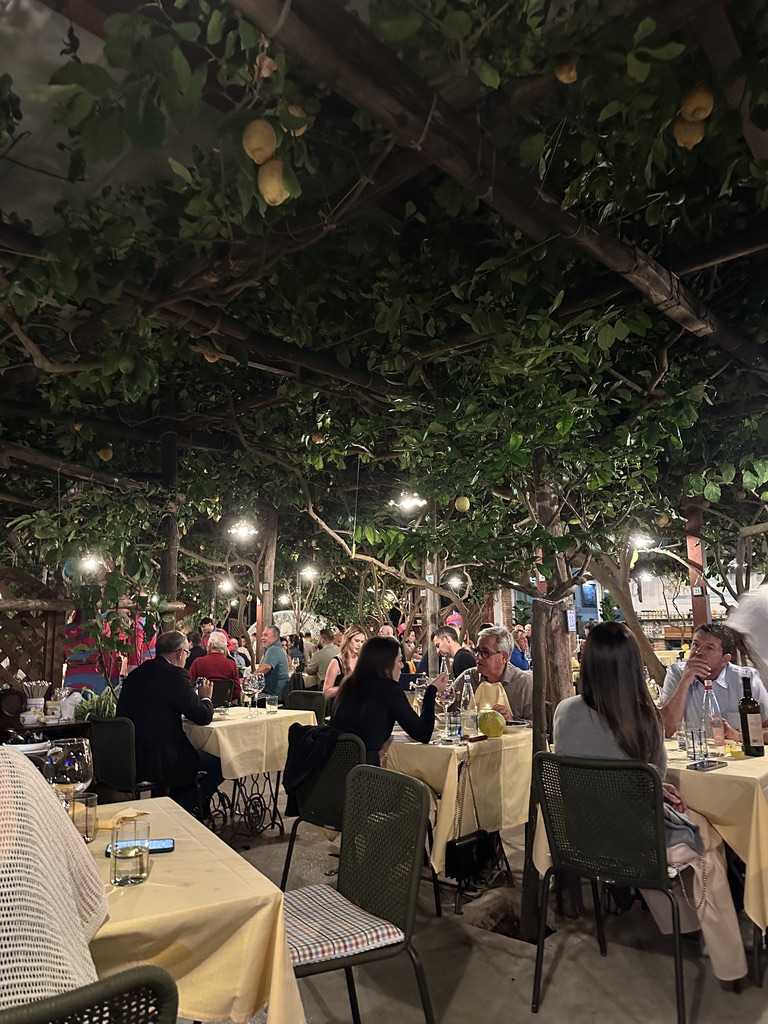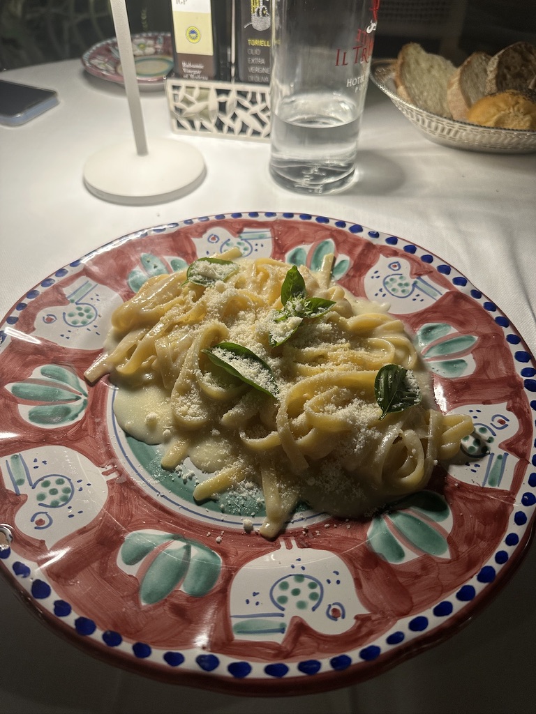 For dinner, we made a reservation at the famous Da Paolino restaurant, a must-visit if you’re in Capri. The restaurant is set in a lemon grove, and many of the dishes pay homage to Capri’s signature citrus. We indulged in grilled mozzarella, lemon tagliolini, and a few other delights, but it was the atmosphere that really made the meal unforgettable.